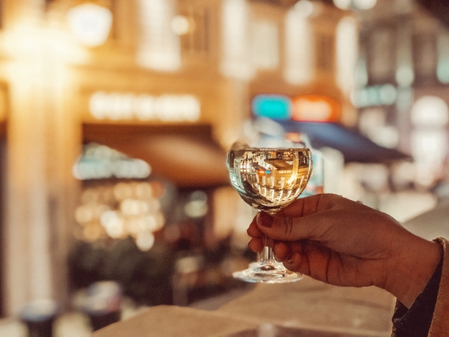 ステムレスワイングラスを下の方で軽く支えて持つ手元